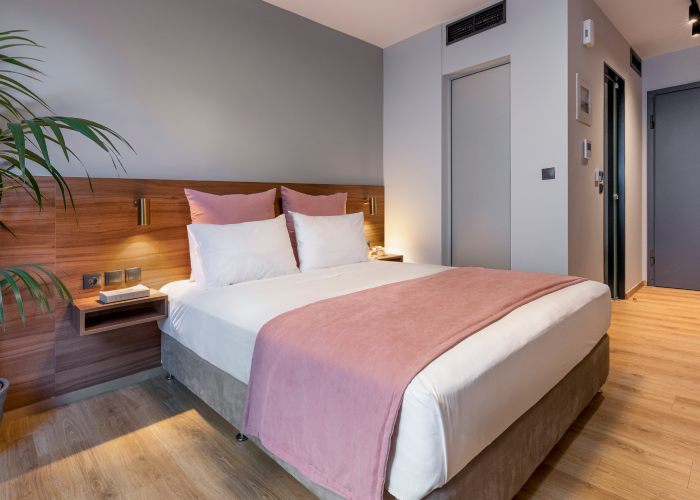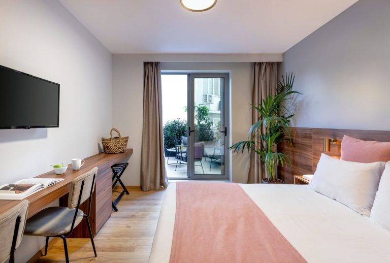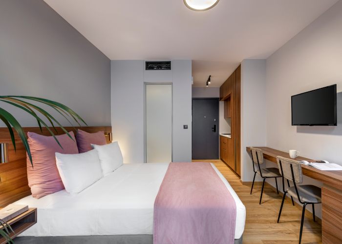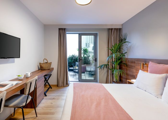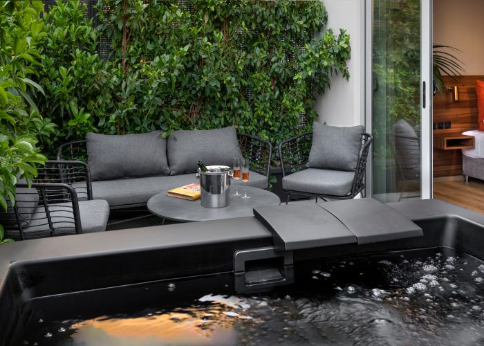 Η Σουίτα προσφέρει επίσης, ένα άνετο μπαλκόνι με μοντέρνα επίπλωση και ιδιωτικό τζακούζι, που αποτελεί μια μικρή όαση για στιγμές πλήρους αναζωογόνησης στην καρδιά της πόλης. Αυτή η πανέμορφη σουίτα 25 τετραγωνικών μέτρων διαθέτει ένα άνετο queen size κρεβάτι, εργονομική μικρή κουζίνα και ένα όμορφο μπάνιο με καμπίνα ντους, ενώ μπορεί να φιλοξενήσει έως 2 ενήλικες και ένα παιδί.